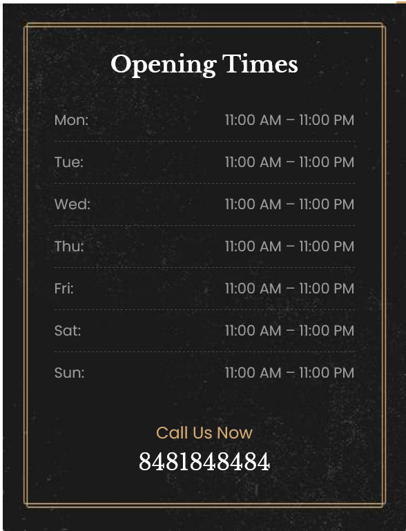 Weekend: 8am to 11pm - Parking available in restaurant premises at free of cost